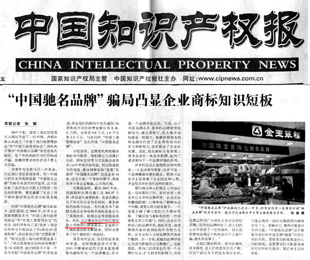 《中國知識產權報》:"中國馳名品牌"騙局凸顯企業商標知識短板