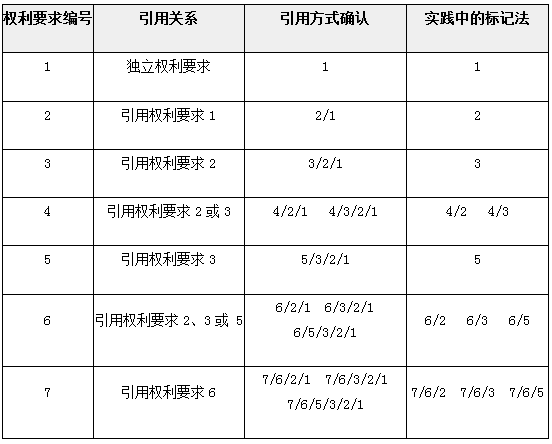 在上表中給出的權利要求引用關系中,在判斷時每個權利要求的每個方案都必須單獨被對待。對于其中存在的多項引用權利要求(上表中的權利要求4、6和7),當其接到拒絕理由、限制要求或審查員的其他要求或意見時,可僅針對單個權利要求提出。例如,對于權利要求4引用權利要求2的方案、權利要求4引用權利要求3的方案,當遇到反對理由時,可僅在反對理由中針對權利要求4提出。