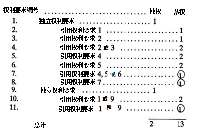 在上面例子中,權利要求1和9是獨立權利要求,權利要求2-3和5-6各自是從屬權利要求,權利要求4引用權利要求2或3,在費用上計算為兩項權利要求;權利要求5-6均直接或間接引用權利要求4,在費用上也各自計算為兩項權利要求;權利要求7和8涉及“多項引用多項”,屬于不符合要求的多項引用權利要求(即前述所謂的“不適合的多項引用權利要求”),因此會被標記為“①”;權利要求10引用了獨立權利要求1或9,因此在費用上按兩項權利要求計算;權利要求11被標記為“①”是因為其非擇一引用的方式(引用“權利要求1和9”,而不是“1或9”)。